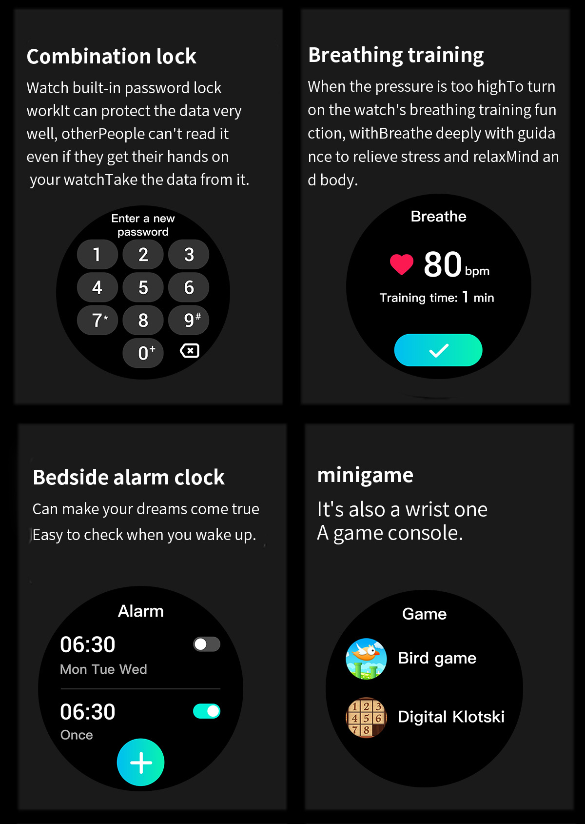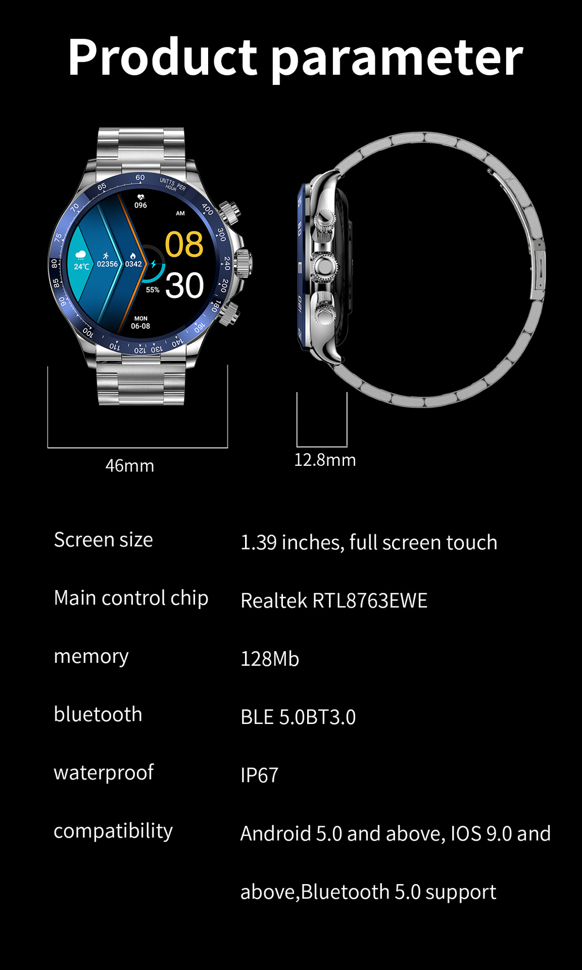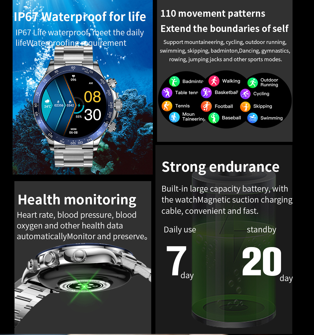 * Fonctions : Étanche, comptage de pas, surveillance de la fréquence cardiaque, mesure de la tension artérielle, mesure de la température corporelle, appel Bluetooth, rappel intelligent, contrôle à distance de l'appareil photo, surveillance du sommeil, détection de l'oxygène dans le sang